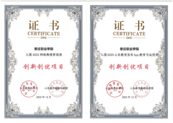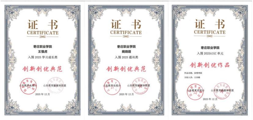 本次评选中,我校入围“2025网络舆情管理类创新创优项目”“2025山东教育发布App教育号运营类创新创优项目”;作品《冰雪枣职》入围“2025 AIGC单元创新创优作品”;王慎虎、阚晓萌两位教师分别荣获“学习成长类”“通讯类”创新创优典范奖。这也是继“枣职融媒”获评2025年度“好网民·在枣庄”正能量社团后,我校在融媒体品牌建设与内容创新方面取得的又一重要成果。
